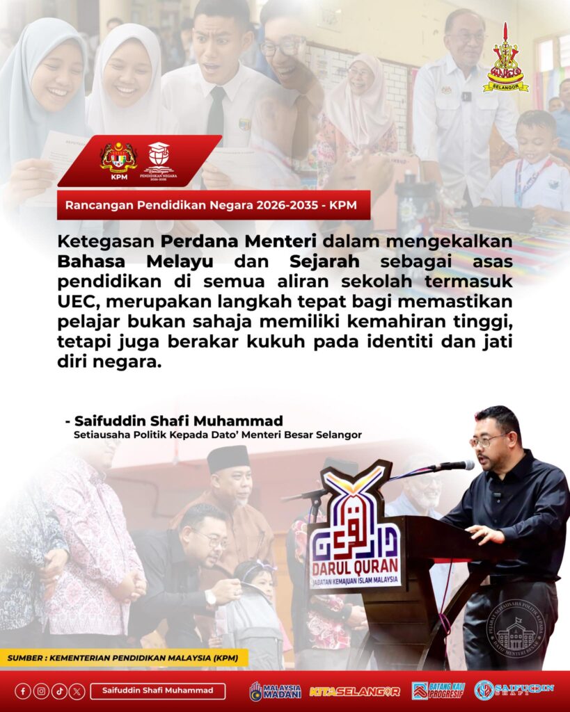 He also supported the Prime Minister’s firm stance on maintaining Bahasa Melayu and History as foundational subjects across all school streams, including institutions following the Unified Examination Certificate (UEC) pathway.