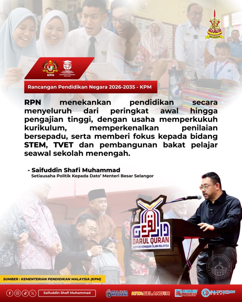 KUALA LUMPUR – The National Education Plan (RPN) 2026–2035 reflects the MADANI government’s serious and long-term commitment to reforming Malaysia’s education system and developing future-ready human capital, said KEADILAN deputy secretary-general Saifuddin Shafi Muhammad.