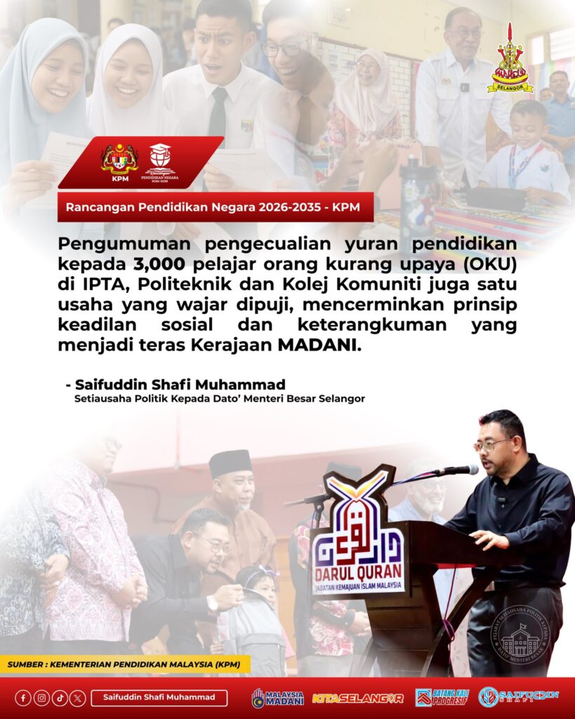 Saifuddin further praised the announcement to exempt tuition fees for approximately 3,000 students with disabilities enrolled in public universities, polytechnics and community colleges, calling it a meaningful reflection of social justice and inclusivity core principles of the MADANI administration.