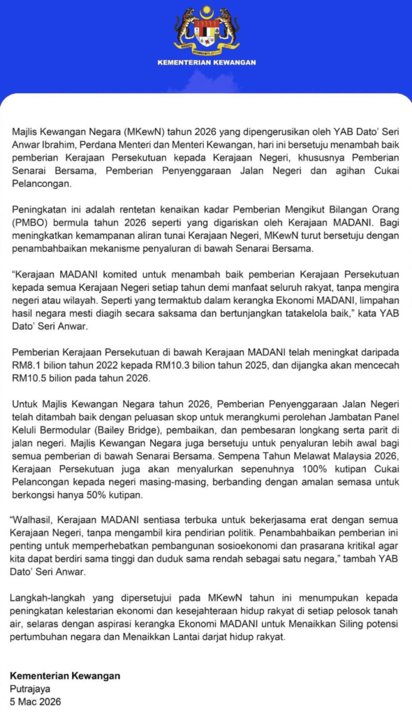 She noted that federal support to the states has steadily increased over the past few years, rising from RM8.1 billion in 2022 to RM10.3 billion in 2025, and is now projected to reach RM10.5 billion in 2026.